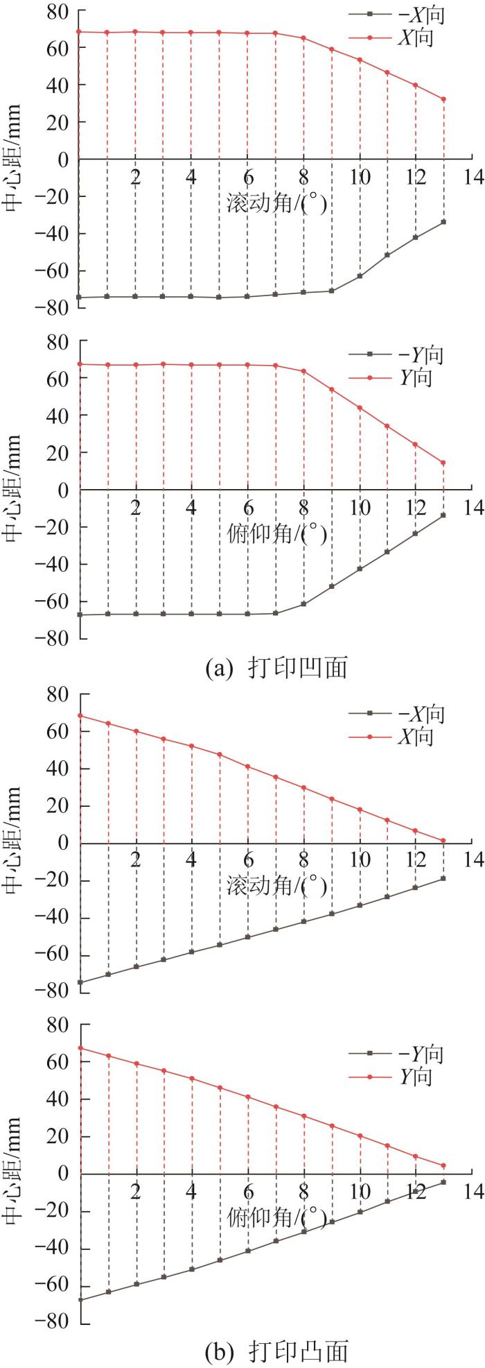 为了明确不同打印角度对打印面积的影响,进行曲面(凹面和凸面)可打印范围分析。在图4所示的打印系统工作空间求解流程第3步中,对机器人动平台的位姿进行设置,设置滚动角和俯仰角为0~13°,并固定动平台位姿,进行定方位系统工作空间求解。对各曲面角度下定方位系统工作空间求交集,即可求解在不同曲面角度下的可打印曲面范围,从而可计算出系统在打印不同曲面角度的皮肤时喷头移动范围的变化。通过控制动平台定方位的滚动角、俯仰角,可以计算出打印系统在不同曲面角度下所能到达的各方向边界位置,并可以直观地呈现角度对打印面积的影响。MATLAB计算结果如图6所示。图中,纵坐标表示喷头左右、前后移动后与静平台中心之间的距离。
