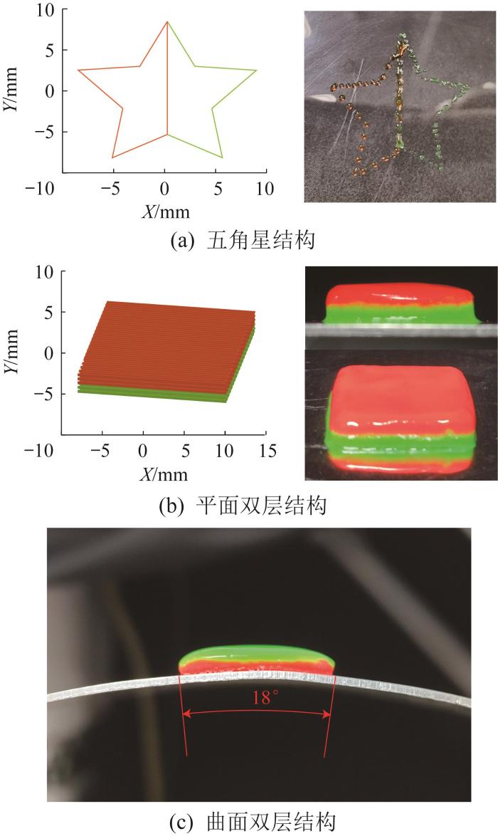 实验结果表明,双喷头曲面打印系统能够实现平面结构和曲面双层皮肤结构的打印。