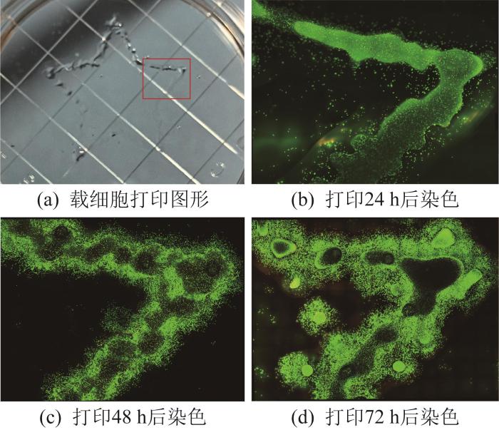 为了验证该皮肤打印系统的功能性和实际应用价值,进行载小鼠成纤维细胞打印实验。打印多组小鼠成纤维细胞后进行紫外线照射,并加入细胞完全培养基。打印所使用的生物墨水为体积分数为5%的GelMA加入0.25%的光引发剂锂苯基-2,4,6-三甲基苯甲酰基次膦酸盐,每10 mL GelMA溶液搭载1×105个小鼠成纤维细胞。在200 μL磷酸盐缓冲液中加入0.4 μL溴乙啡锭二聚体1和0.1 μL钙黄绿素乙酰氧基甲酯,作为染色材料,分别在打印完成24、48、72 h后进行细胞死活染色,观察细胞存活率和生长情况。打印细胞死活染色结果如图9所示。图9(a)中红框所示为死活染色观察范围,图9(b)、(c)、(d)中绿色为活细胞,红色为死细胞。