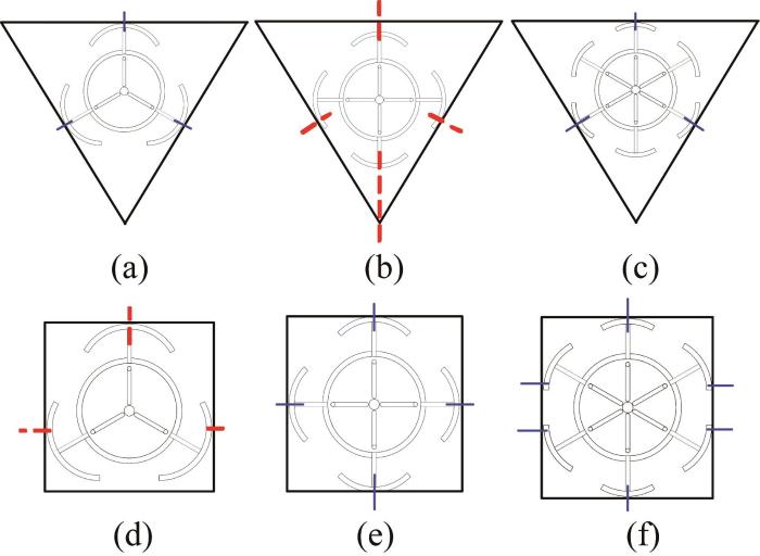 考虑到机器人的运动稳定性和整体质量,伸缩杆的数量宜控制在3~6根。如图2 (a)所示,3根伸缩杆在三角形空间内受力均匀,而4根伸缩杆在该空间内受力不均匀,如图2 (b)所示。在矩形空间内,3根伸缩杆受力不均匀,见图2 (d),而4根伸缩杆在该空间内受力均匀,见图2 (e)。如图2 (c)和图2 (f)所示,6根伸缩杆在2种空间内均受力平衡,适应性较强(根据对称性原则,不考虑5根伸缩杆)。综合考虑,本文设计的可变径平台由6根伸缩杆沿径向均匀分布形成。