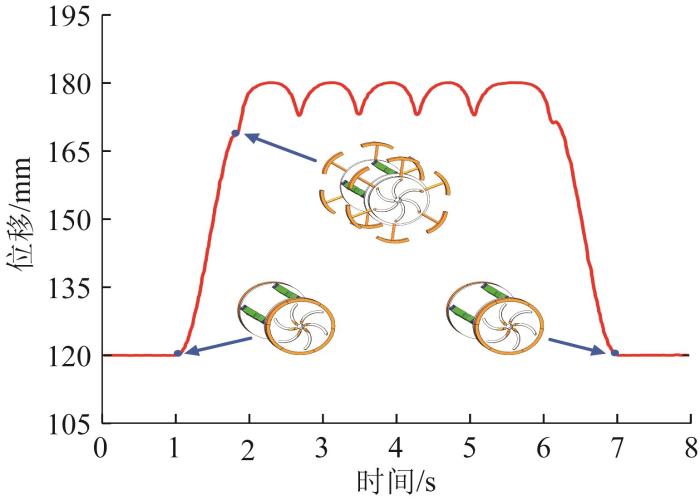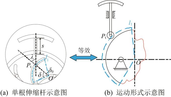 机构,其推程段轮廓用于实现驱动力传递;伸缩杆在力封闭作用下作为凸轮机构的从动件。如图4 所示,随着伸缩杆在偏心圆形凸轮机构外轮廓处的位移变化,其运动轨迹由直线变为凸轮曲线,以适应不同地形下的外力变化。