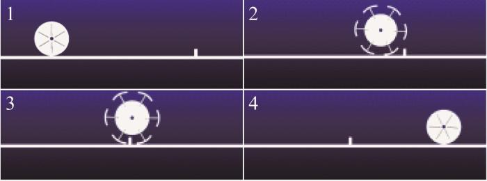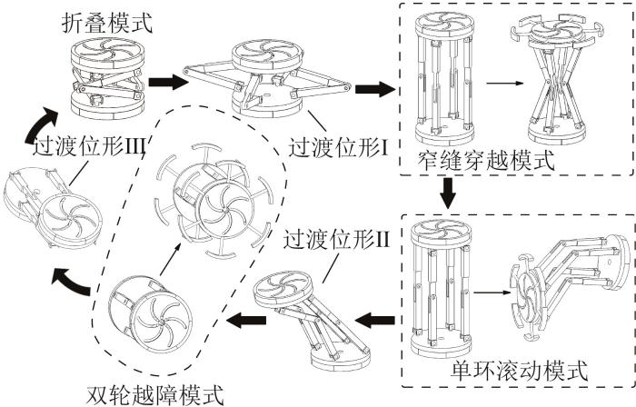 当各URU支链中的运动副轴线方向发生变化时,其旋量与约束轴线都将发生变化,进而导致机器人自由度发生变化,最终实现机器人的模式切换。如图6 所示,本文所设计的机器人包括便于携带的折叠模式、适用于在狭窄空间内移动的窄缝穿越模式、适用于台阶攀爬的单环滚动模式以及适用于跨越障碍物的双轮越障模式。折叠模式通过过渡位形Ⅰ切换为窄缝穿越模式;窄缝穿越模式在初始位形下通过U副轴线变化切换为单环滚动模式;单环滚动模式通过过渡位形Ⅱ切换为双轮越障模式;双轮越障模式通过过渡位形Ⅲ切换回折叠模式。