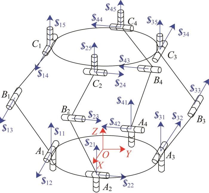 单个可变径平台仅需1个驱动电机即可带动6根伸缩杆运动,故其自由度固定,不受机器人模式切换的影响。因此,下文将对可变径多模式移动并联机器人的主体——4-URU并联机构进行自由度分析。