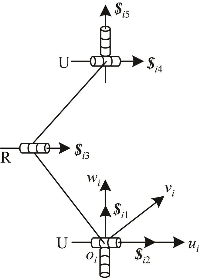 如图7 所示,4-URU并联机构中所有U副沿轴线方向分布2个垂直相交的螺旋,R副沿轴线方向分布单个螺旋。选取其中一条URU支链进行分析,如图8 所示。以螺旋$ i 1 和$ i 2 的交点oi 为坐标原点,建立支链局部坐标系o i - u i v i w i 。