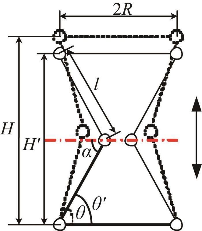 机器人的纵向面折展比需要从支链角度入手。URU支链的折展原理如图10 所示。假设上平台相较于下平台的初始高度为H ,折叠后的高度为H ' ,连杆长度为l ,连杆与下平台的初始夹角为θ ,折叠后的角度为θ ' ,纵向折叠角度为α ,且α =θ ' 。通过分析可知: