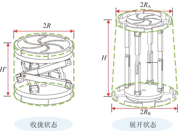 机器人的体折展比是反映其整体折展能力的重要指标。所设计的机器人在收拢与展开状态下的体积包络示意如图11 所示。基于上文对面折展比的分析,根据图11 综合得到该机器人的体折展比。在展开状态下,假设上、下平台的外接圆半径分别为R A 和R B ,则有: