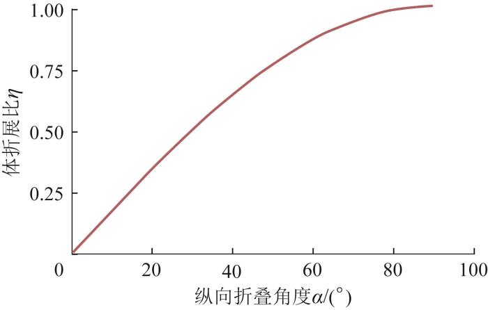 当上下平台均完全展开时,展开状态下的包络体积达到最大,此时R A = R B 。若初始夹角θ =90°,根据折叠过程中存在的等量关系,当纵向折叠角度α ∈ [0°, 90°]时,机器人的体折展比变化曲线如图12 所示。