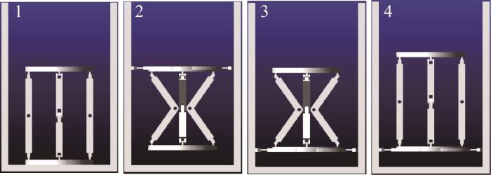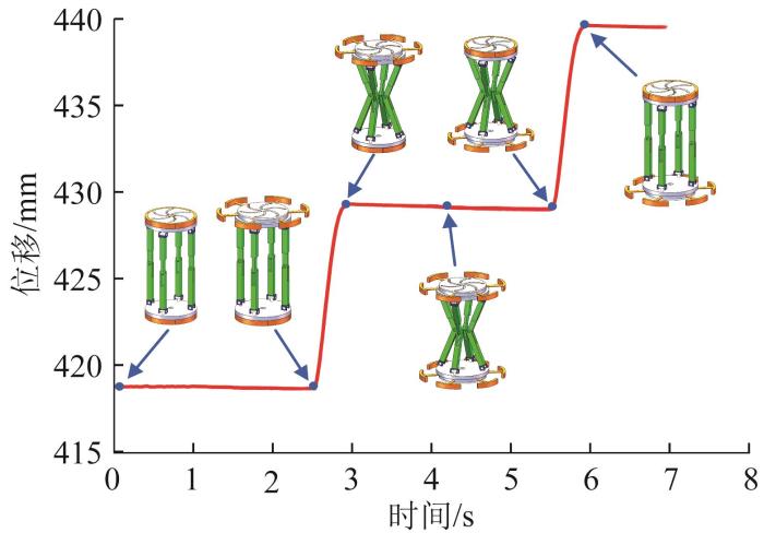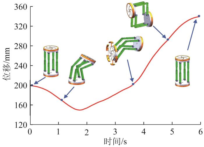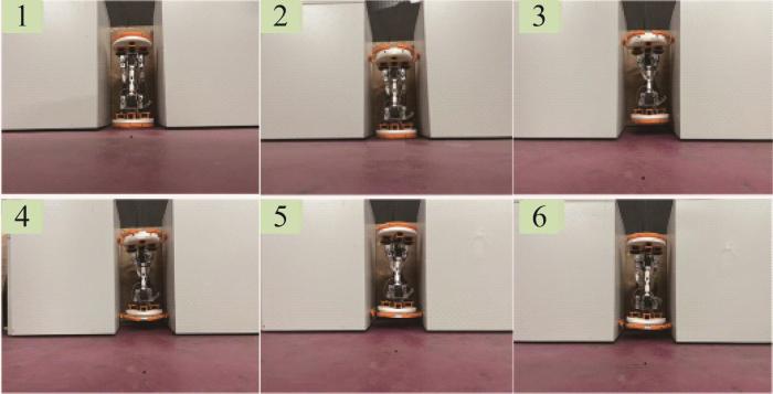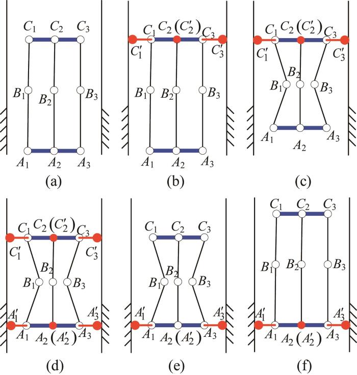 机器人的窄缝穿越步态如图13 所示。其中:图13 (a)所示为窄缝穿越过程的初始位置,此时支链A i C i 呈向内竖直状态;图13 (b)所示为平台C 1 C 3 向外展开伸缩杆,当C 1 ' 和C 3 ' 接触窄缝内壁时停止;图13 (c)所示为支链A i C i 呈向内收拢状态,此时平台A 1 A 3 向上升高;图13 (d)所示为平台A 1 A 3 向外展开伸缩杆,当A 1 ' 和A 3 ' 接触窄缝内壁时停止;图13 (e)所示为平台C 1 C 3 的伸缩杆向内收拢;图13 (f)所示为支链A i C i 呈直线状态,平台C 1 C 3 再次升高。重复图13 (a)至图13 (f)所示的步态,机器人可实现在窄缝内的向上穿越。