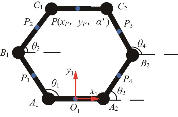 当机器人切换为单环滚动模式时,其4条支链两两平行,其中支链A 1 C 1 与支链A 3 C 3 的动作相同,支链A 2 C 2 与支链A 4 C 4 的动作相同,从侧面观察,整个机器人可等效为平面6R连杆机构。单环滚动模式下机器人的运动学模型如图14 所示。在A 1 A 2 中点O 1 处建立直角坐标系O 1 - x 1 y 1 z 1 ,以A 1 和A 2 的连线为x 1 轴,指向A 2 方向为正,垂直地面向上为y 1 轴正方向,P 点为C 1 和C 2 的中点;Pk (k =1, 2, …, 4)为杆A 1 B 1 、B 1 C 1 、B 2 C 2 和A 2 B 2 的中点。杆A 1 B 1 、A 2 B 2 、B 2 C 2 、B 1 C 1 与x 1 轴的夹角分别为θ 1 、θ 2 、θ 3 、θ 4 ,取逆时针方向为正方向。