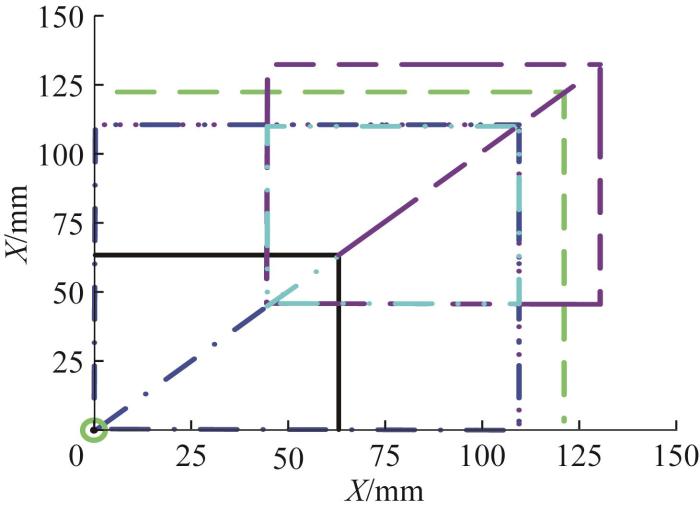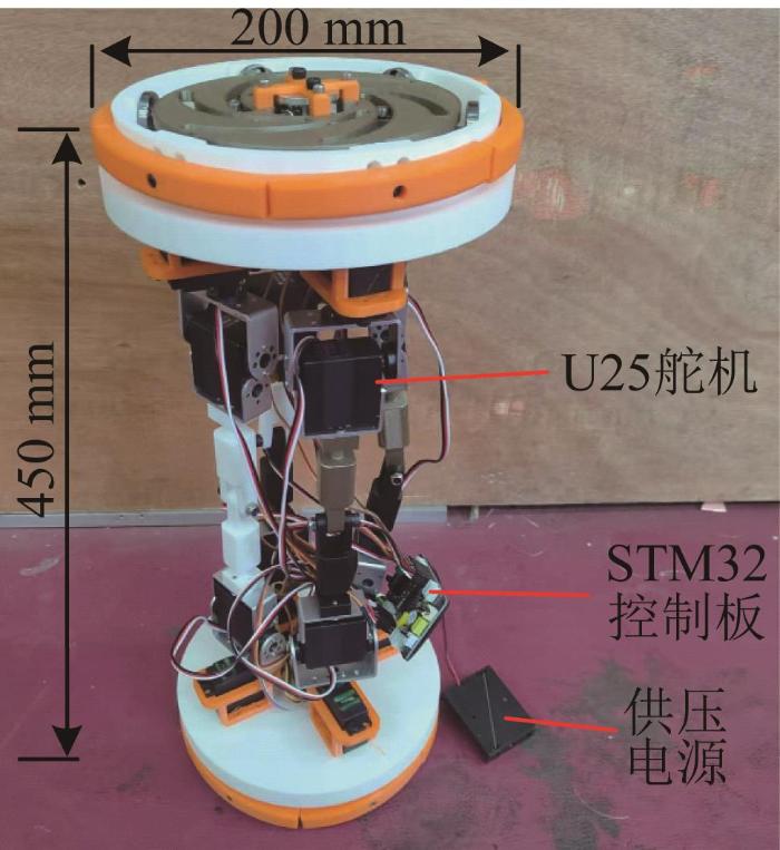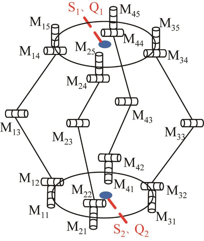 ... 根据文献[21 ],将各伺服舵机与减速电机的工作状态分为驱动(●)、锁定(○)、失效(⊗)三种类型.通过改变伺服舵机与减速电机的工作状态,使机器人的自由度发生变化,从而实现不同运动模式的切换.对于分布在各支链上的伺服舵机M i j ,当M i j 处于驱动状态时,与主动副相连的连杆之间的角度可根据要求改变;当M i j 处于锁定状态时,与主动副相连的连杆之间的角度无法改变;当M i j 处于失效状态时,与主动副相连的连杆之间的角度可随意改变.对于分布在平台上的减速电机S1 、S2 、Q1 和Q2 ,仅有驱动(●)、锁定(○)两种状态.不同模式下驱动电机的状态如表2 所示,其中虚线框内S、Q独立表示. ...