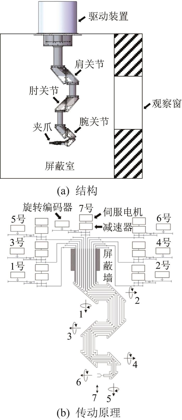 考虑到在涉核环境中不允许使用电机、传感器等电子元件,机器人采用全齿轮耦合传动,外壳采用不锈钢材料,且采取全密封设计。机器人结构及传动原理如图1 所示。伺服电机等电子元件均放置于机器人顶端,以保证机器人能正常、可靠地运行。
