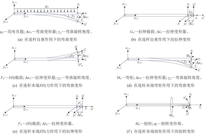 考虑到机器人存在关节偏置,且连杆2、连杆3的长度较长,产生的柔性变形较为显著,为精确求解机器人连杆末端广义力及末端变形,在连杆2和连杆3的末端新增了2个坐标系{2*}和{3*},如图3 (b)所示。考虑到坐标系较多,为了突出2个新增坐标系,图3 (b)中略去了部分原坐标轴的标注。