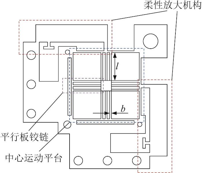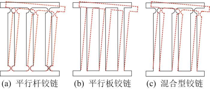 ... 在柔性放大机构的运动过程中,柔性铰链为主要变形载体,通过其弹性变形来实现位移的传递与放大.常见的柔性铰链分为平行杆铰链、平行板铰链及混合型铰链三种类型,如图1 所示.平行杆铰链的两端通过转动副连接,在工作时变形主要集中在铰链部位,而杆件自身的变形可忽略不计.平行板铰链由2片或多片薄板平行排列组成,依靠薄板的弯曲变形实现位移输出,其具备较小的耦合效应和较强的变形能力,适用于大位移运动平台.混合型铰链的性能介于上述两者之间.在这3种铰链中,平行板铰链具有最小的等效质量和最高的刚度[11 ] .因此,本文选择平行板铰链作为变形机构. ...