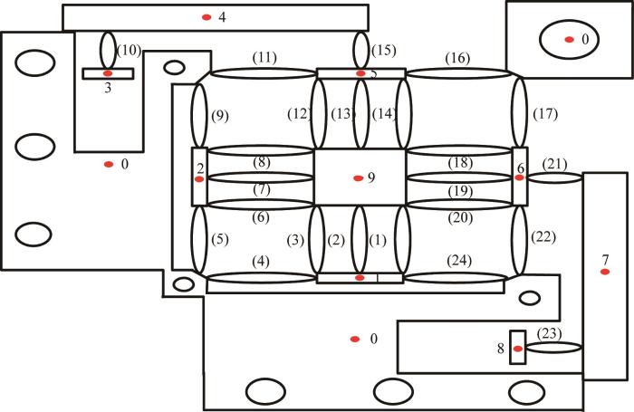 通过离散化,连续结构可被划分为有限数量的节点和单元[14 ] 。本文所设计的精密运动平台可以被离散化为由多个柔性单元和集中质量节点构成的结构,如图6 所示。将各柔性单元和集中质量节点依次进行编号,各柔性单元编号为q (q =1, 2, …, 24),集中质量节点编号为p (p =1, 2, …, 9);所有固定边界条件均标记为0。该精密运动平台的输入力分别作用于节点3或节点8,其输出端对应节点9。