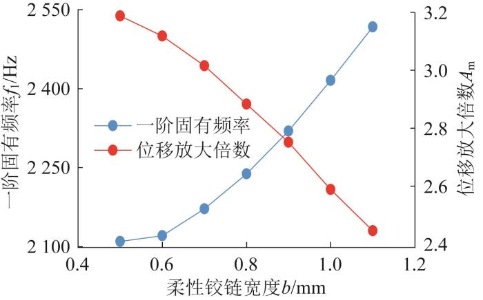 首先,分析柔性铰链宽度b 对精密运动平台性能的影响。在保持单个平行板铰链中柔性铰链数量为3、长度l =16 mm、高度h =10 mm的情况下,设定铰链宽度b =0.5~1.1 mm,并对精密运动平台输入端施加1 μm位移。基于上述约束条件,利用MATLAB软件对不同柔性铰链宽度下精密运动平台的一阶固有频率和位移放大倍数进行分析,结果如图7 所示。