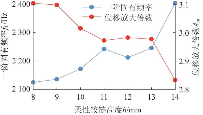 由式(16)至(18)可知,铰链宽度b 主要影响轴向刚度Kx ,铰链高度h 主要影响弯曲刚度Ky ;铰链宽度b 是影响位移放大倍数A m 的主要参数,铰链高度h 是影响固有频率f 的关键因素。