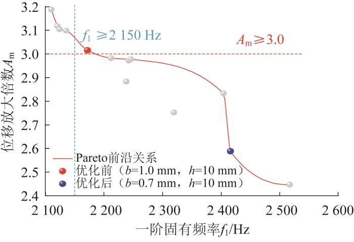 根据式(14)所示的动力刚度模型,可将精密运动平台的位移放大倍数A m 和固有频率f 表示为设计变量(柔性铰链的宽度b 和高度h )的显式函数: