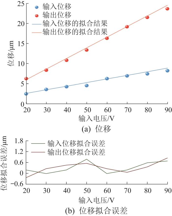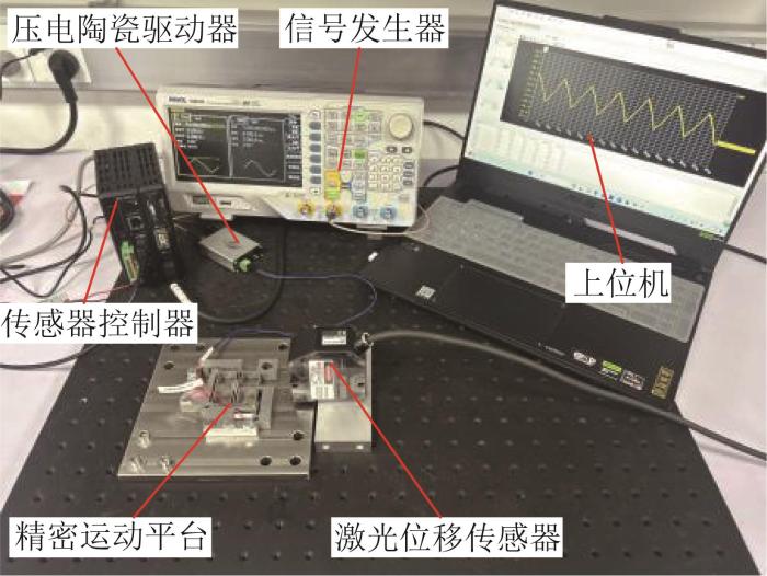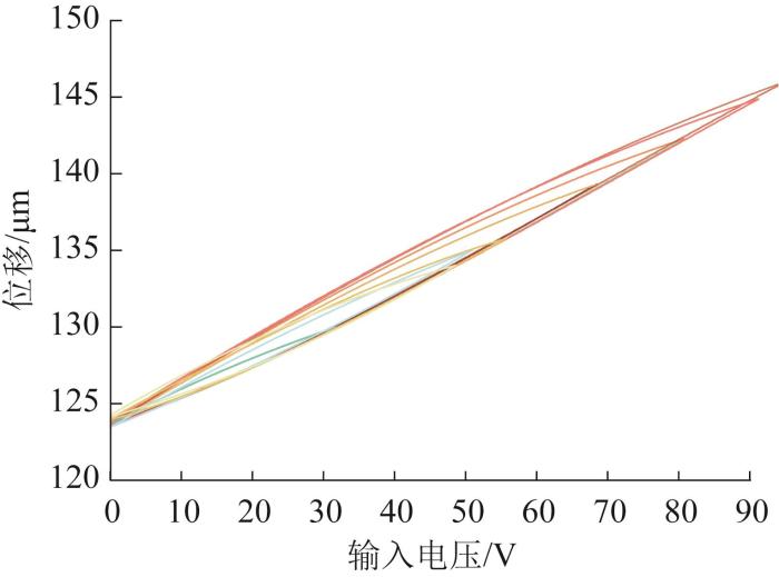 ... 基于图15 所示的压电驱动系统性能测试平台,利用上位机对精密运动平台的位移信号进行采集与处理.在驱动频率固定为10 Hz的条件下,通过实验测得精密运动平台在不同输入电压下的位移响应曲线(三角波信号),如图16 所示.从图16 中可以观测到,精密运动平台存在明显的迟滞现象,这主要是由压电陶瓷材料固有的迟滞特性导致的[21 ] .实验测得的精密运动平台的输入位移、输出位移及其线性拟合结果和对应的位移放大倍数分别如图17 和表3 所示. ...