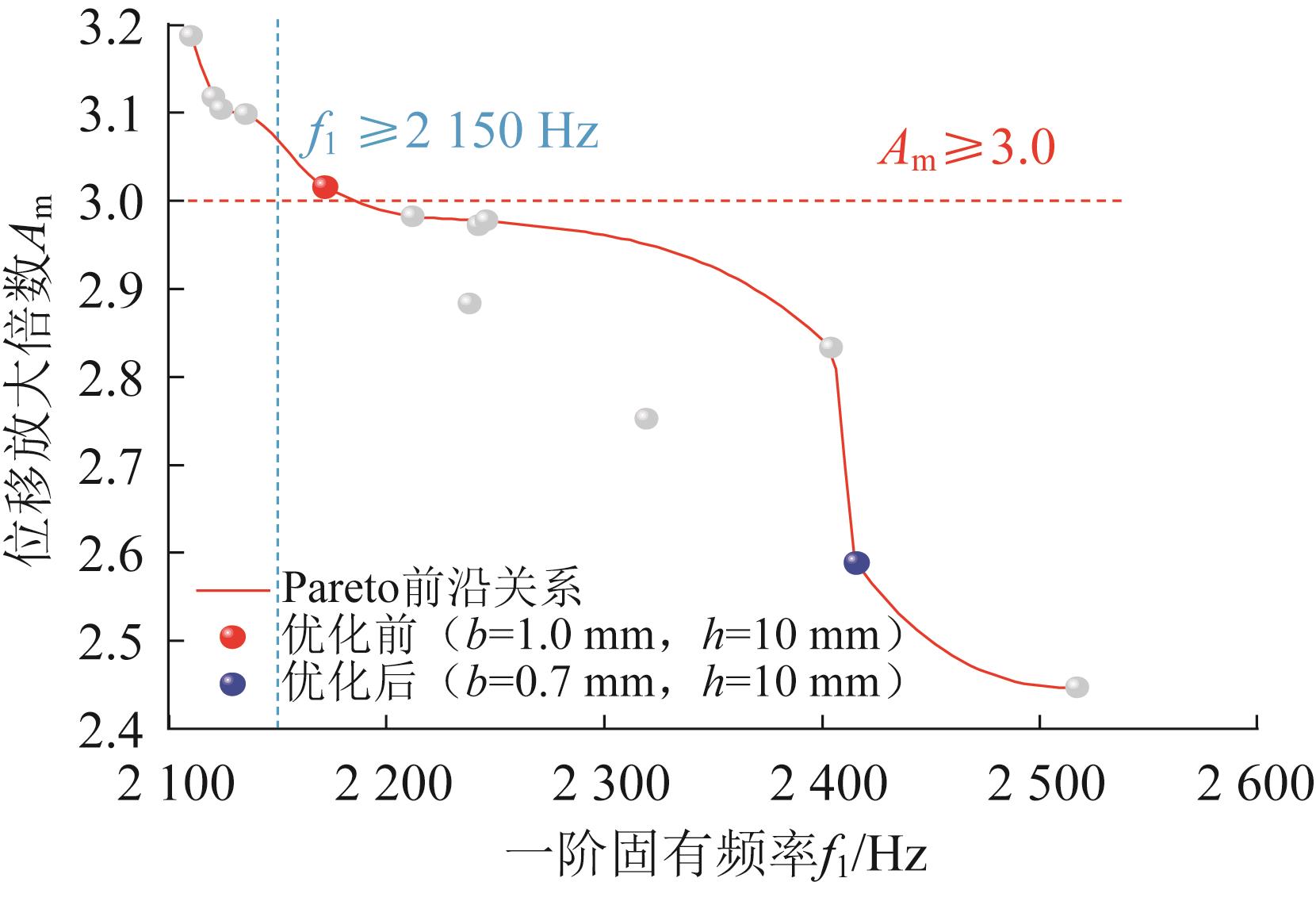 | 图9 位移放大倍数与一阶固有频率的Pareto前沿关系 |