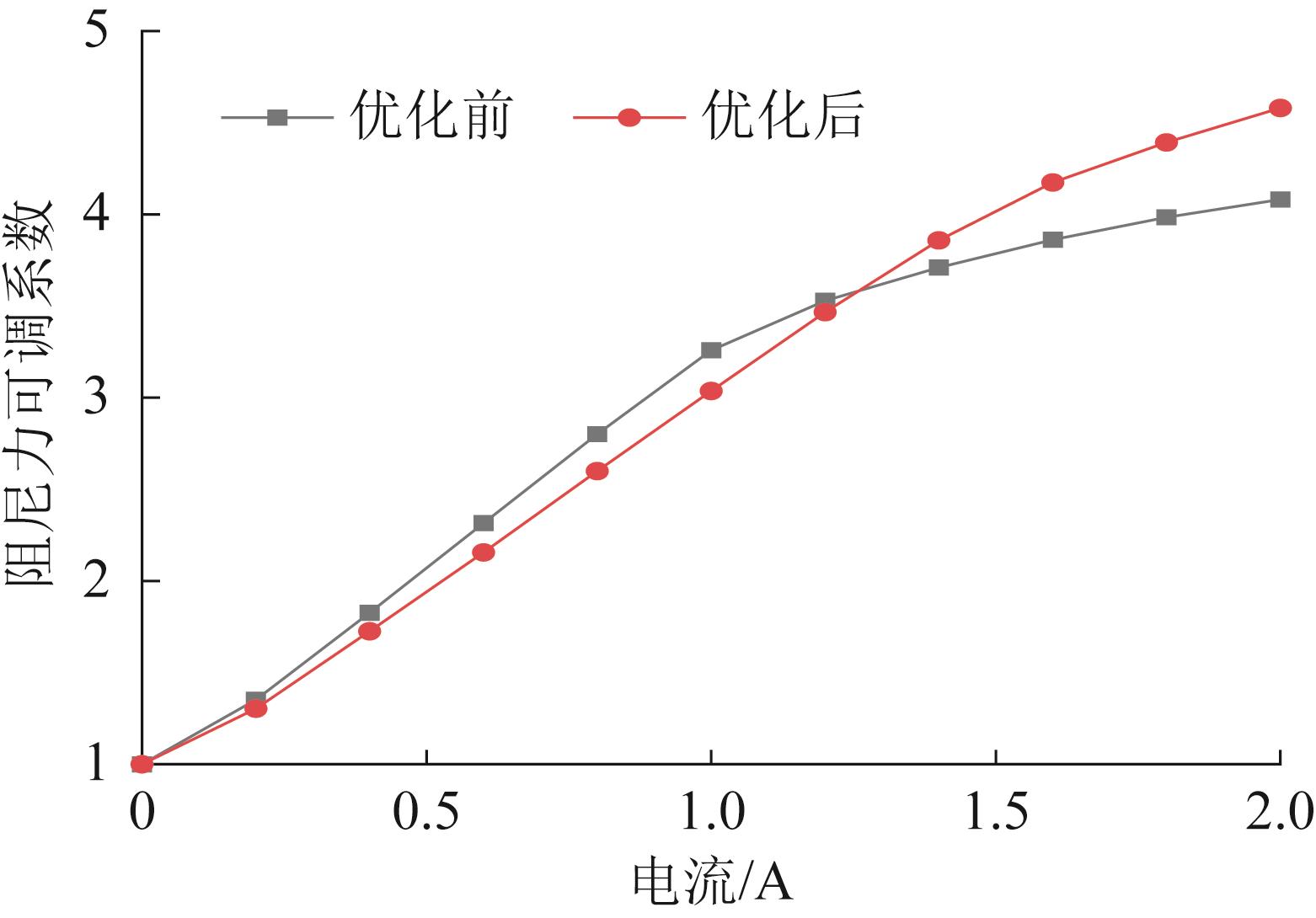 | 图14 优化前后阻尼力可调系数随电流的变化曲线 |