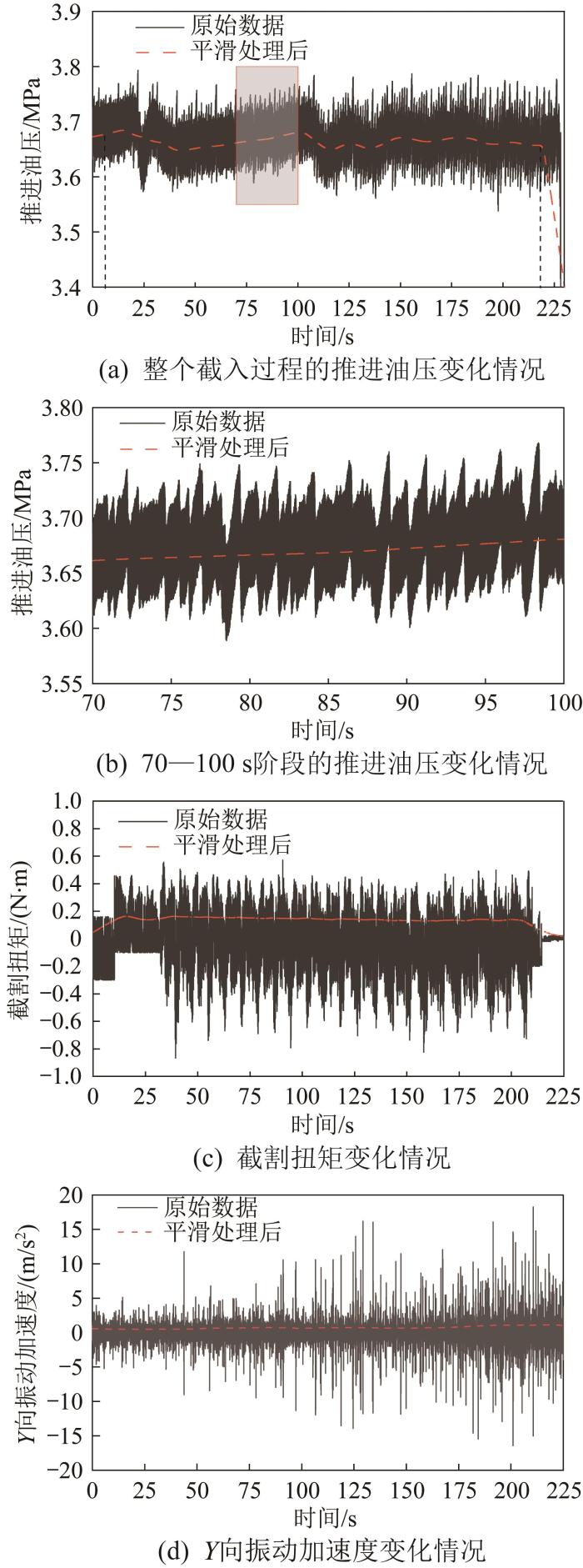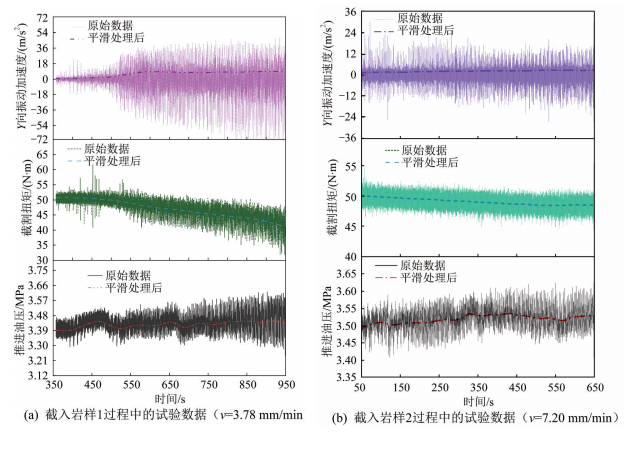 1)在中心鱼尾刀截入岩样过程中,推进油压、截割扭矩、Y向振动均随截入过程呈现出波动式增大趋势,且三者的波动位置基本一致;根据3种数据的变异系数,发现振动数据的相对离散程度最高,即数据最不稳定;推进油压数据的相对离散程度最低,数据最稳定。相同转速、不同推进速度下的多次试验表明,在低推进速度阶段(v=3~5 mm/min),随着推进速度的增大,推进油压、截割扭矩、Y向振动的增速较快;在高推进速度阶段(v=5~14 mm/min),随着推进速度的增大,推进油压、截割扭矩、Y向振动的增速变缓。