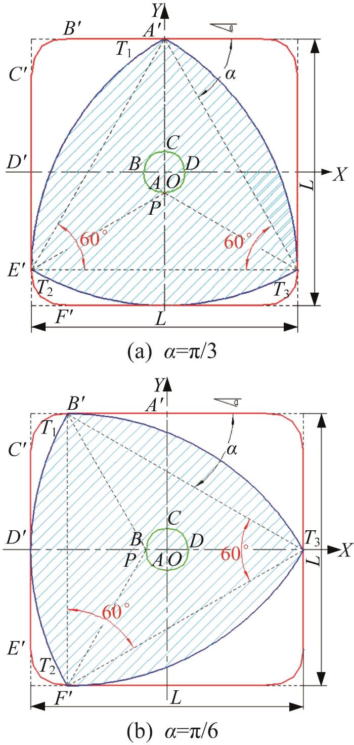 以边长为L的等边△T1T2T3作为基础图形,分别以顶点T1、T2和T3为中心、半径为L作圆弧T1T2、T2T3、T3T1,这3条圆弧所围成的图形即为勒洛三角形。假设勒洛三角形在边长同为L的正方形内转动,记正方形的中心为O,勒洛三角形的中心为P,勒洛三角形的3个角(顶)点分别为T1、T2、T3,勒洛三角形的直边T1T3与正方形边的夹角为α。当勒洛三角形的中心P沿ABCD顺时针运动时,角点T1沿逆时针方向运动。当P点从A点运动到B点时,勒洛三角形的角点T1从A'点运动到B'点,即α从π/3变化到π/6;角点T2从