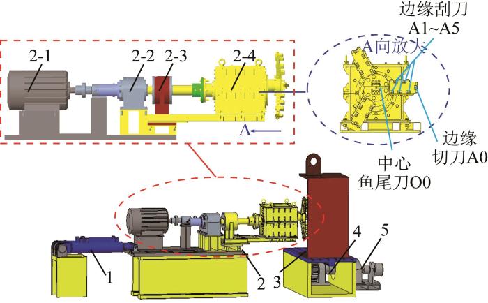 1—推进装置;2—截割装置;2-1—截割电机;2-2—减速器;2-3—轴承座;2-4—全断面矩形截割刀盘;3—岩样;4—岩样推移装置;5—液压泵站及控制装置。