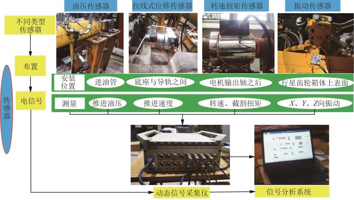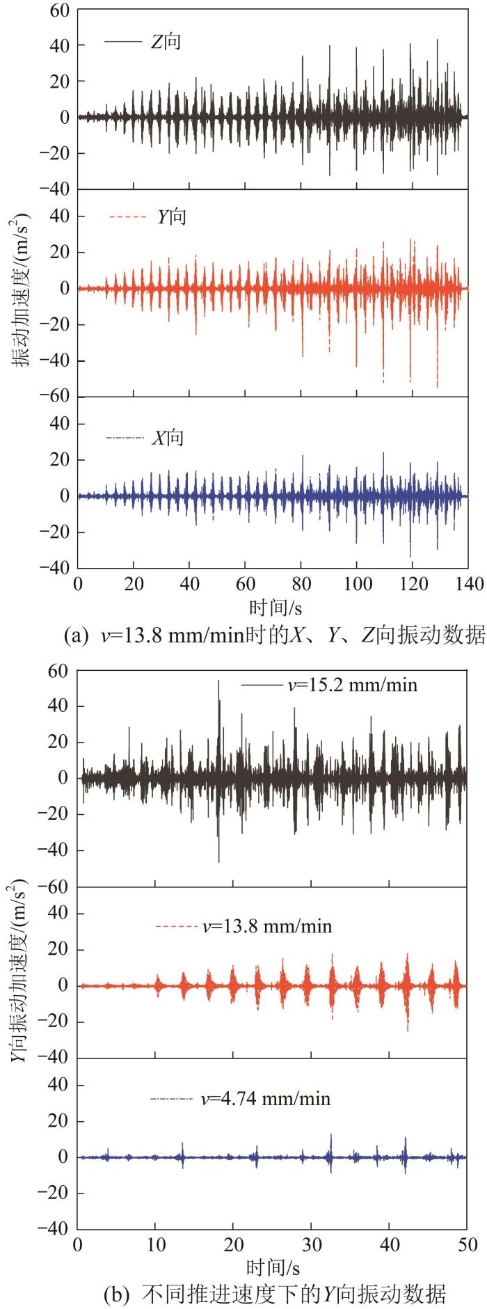 拉线式位移传感器一端固定在推进底座上,另一端固定在推进导轨上,通过测量推进平台的位移和对应的时间,间接计算推进速度;转速扭矩传感器安装在截割电机输出轴与减速器输入轴之间,用于测量传动轴的转速和扭矩,以间接反映刀盘转速和截割扭矩;振动传感器安装在行星齿轮箱体上表面靠前位置处,用于测量行星齿轮箱体的三向振动加速度(X正方向为平行于传动轴方向并指向岩样,Y正方向为沿径向水平向里,Z正方向为竖直向上),以反映刀盘的振动情况。通过动态信号采集仪连接各个传感器与计算机,并在信号分析系统中为每个传感器设置专门的数据传输通道。