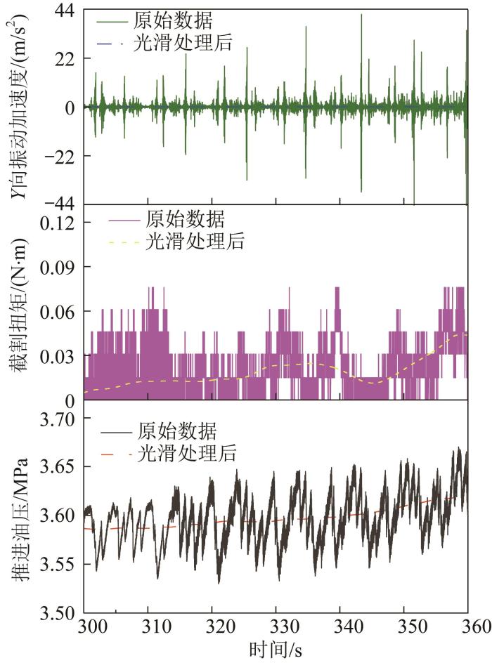 在不同推进速度下,开展了中心鱼尾刀截入岩样1、岩样2的截割试验。在中心鱼尾刀截入岩样1过程中(刀盘转速n=6 r/min,推进速度v=4.74 mm/min),推进油压、截割扭矩、Y向振动加速度随截入过程的变化情况如图10所示(重点关注截割过程,未关注起始和结束阶段,故仅展示300—360 s阶段)。