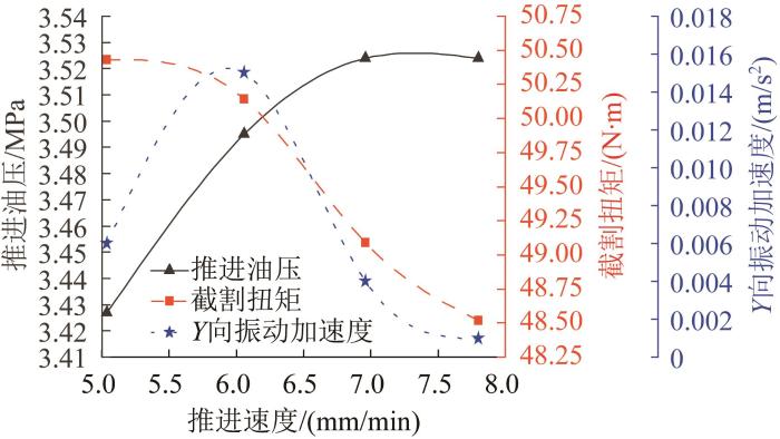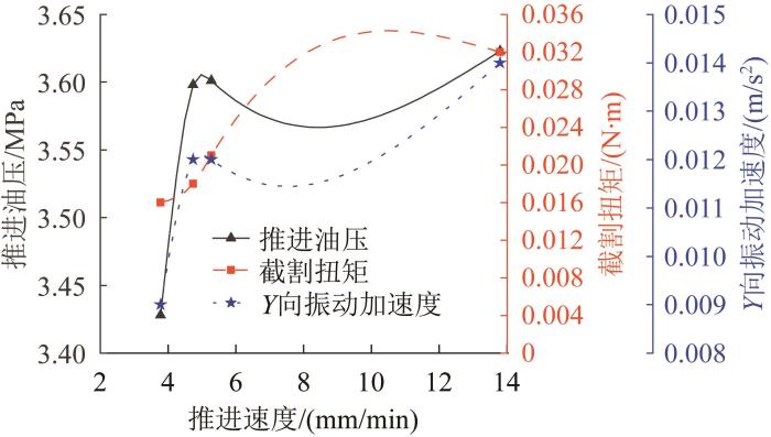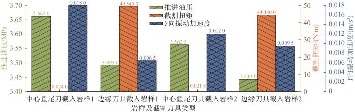 2)在边缘刀具截入岩样过程中,推进油压、Y向振动呈波动式增大,但截割扭矩呈波动式减小,这与多刀具协同破岩效果有关;随着推进速度的增大,边缘刀具截入岩样过程中的推进油压逐渐增大,截割扭矩逐渐减小,Y向振动先增大后减小。