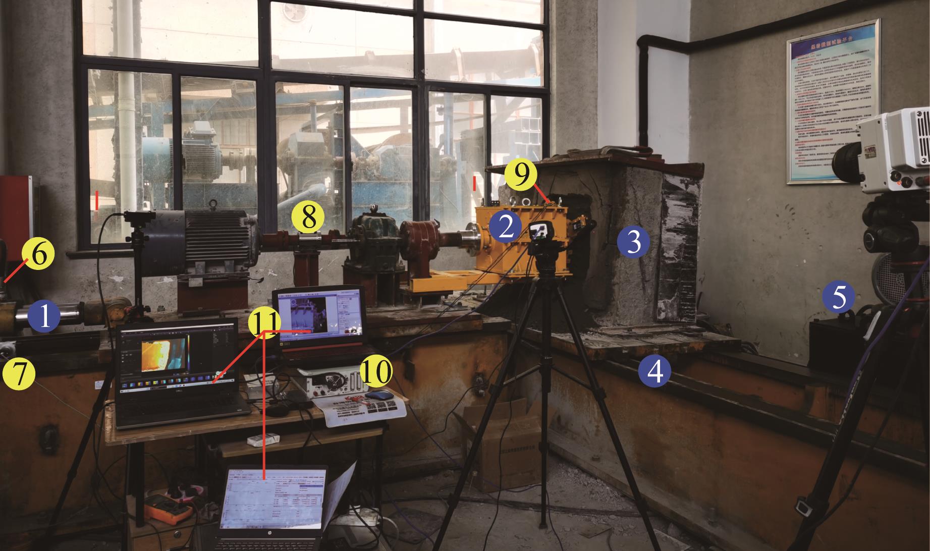 | 图7 刀盘截割试验台实物图1—推进装置;2—截割装置;3—岩样;4—岩样推移装置;5—液压泵站及控制装置;6—油压传感器;7—拉线式位移传感器;8—转速扭矩传感器;9—振动传感器;10—动态信号采集仪;11—计算机。 |