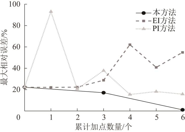 由表3 可知:在3种加点方法的迭代步Step 1,初始最大相对误差达到91.86%;EI和PI方法的加点效率较低,本文方法实现了并行加点,加点效率较高。