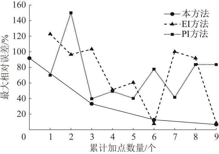 由表1 可知:在3种加点方法的迭代步Step 1,由于初始样本数量不足,代理模型的精度都较低,初始最大相对误差达到了22.24%;在相同加点数量的情况下,EI和PI方法由于每次只能产生1个新样本点加入样本空间,因此与本文方法相比,加点效率较低,而本文方法实现了并行加点,提高了加点效率;同时,EI和PI方法最终均未能获得满足误差要求的最优解,在迭代步Step 7时的最大相对误差分别为54.88%和15.77%,这可能是由于所选新样本与初始样本相似性较高,不能有效提升代理模型精度,需要补充更多迭代步和样本点才能满足对误差的要求,而本文方法仅经过2次加点循环便得到了满足要求的最优解。
