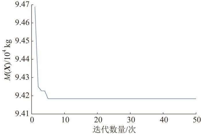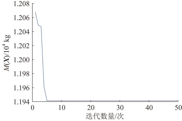 优化过程中设置初始样本数量为15个,ε =0.05,采用Kriging模型来近似目标函数和约束函数,优化求解算法采用GA。GA的参数设置如下:种群规模为5,交叉概率为0.5,最大迭代次数为200。当最优个体适应度值在连续50代内的改进幅度小于1×10⁻⁶时,认为模型收敛。本文方法的迭代步及其最大误差如表5 所示,优化过程中斗轮机上部结构质量的收敛曲线如图6 所示,最终的优化结果如表6 所示。