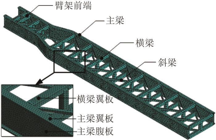 塔式起重机是建筑工地、矿山及大型工业工程项目中广泛使用的高空重物吊装设备。其前臂架结构是关键承载部件,通过在水平及垂直方向的移动,实现重物的移动与提升。前臂架结构的安全性直接影响着起重机整体的工作性能及运行稳定性。为了提升起重机的综合性能,本文基于结构优化设计方法,对其前臂架结构进行轻量化设计。起重机前臂架结构的有限元模型如图7 所示。其中,前臂架结构采用壳单元建模,单元类型为shell 181,材料选用Q345,单元数量为63 788个,节点数量为34 492个。