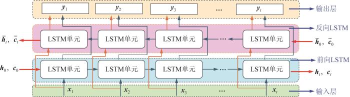 BiLSTM网络结合了2个方向的LSTM层,通过前后向时序数据的输入,更好地找出序列中的潜在联系,弥补了单一LSTM网络仅考虑前向时序数据的不足[23 ] 。BiLSTM网络模型的结构如图3 所示。将传输的时序数据x = [ x 1 x 2 ⋯ x t ] 分别输入前向LSTM层和反向LSTM层,前向和反向LSTM层都包含多个LSTM单元。其中:前向LSTM层学习输入序列的历史数据信息 c t -1 ,并由当前时刻的LSTM单元和前一时刻的LSTM单元给出相应的隐藏状态信息 h t -1 ,其输出由最后时刻的输入及前一时刻的隐藏状态决定;反向LSTM层对输入序列的未来数据信息进行学习,输出与前向LSTM层一致;两者输出特征进行堆叠,形成最终的输出y = [ y 1 y 2 ⋯ y t ] 。可表示为: