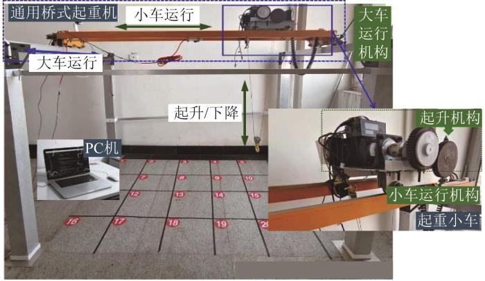 本文以DQ40 kg-1.8 m-1.3 m小型通用桥式起重机为研究对象。其整机性能参数:工作级别为A5,额定起重质量为25 kg,小车及吊具的质量为18 kg,主梁长度为2 000 mm,最大起升高度为1 000 mm,小车运行速度为0.2~0.25 m/s,大车运行速度为0.15~0.2 m/s,小车轮距为400 mm。起重机运行实验平台如图4 所示,其工作循环过程如图5 所示。