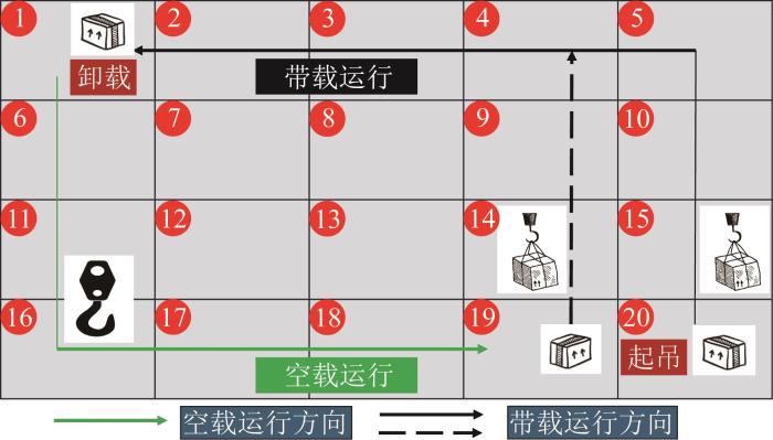 起重机工作循环过程为:从区域20开始起吊货物,到达指定的1号区域(卸货区)将货物卸载,并沿空载运行方向空载返回至区域19,第1个工作循环结束;在区域19再次起吊,运行至1号区域将货物卸载,沿空载运行方向空载返回至区域18,第2个工作循环结束;以此类推,起重机分别从区域18、区域17、区域16、区域15、区域14、区域13和区域12起吊货物,并将货物放置在1号区域,卸载后空载运行至相应区域。