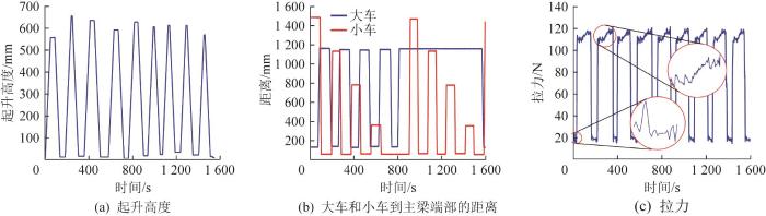 在不同负载下采集各参数.以8.85 kg负载为例,9个工作循环周期内参数采集结果如图7 所示.由图可知:在货物起吊过程中起升高度呈快速上升趋势,起升拉力出现振荡,其归因于起升冲击效应;当货物起吊至指定高度后,大车和小车开始向卸货区移动,此时起升高度不变,拉力随着大小车的移动出现变化,其归因于大小车运行冲击效应;在货物卸载阶段,吊具高度开始下降,拉力随着货物卸载而骤减.整个工作过程呈现周期性变化. ...