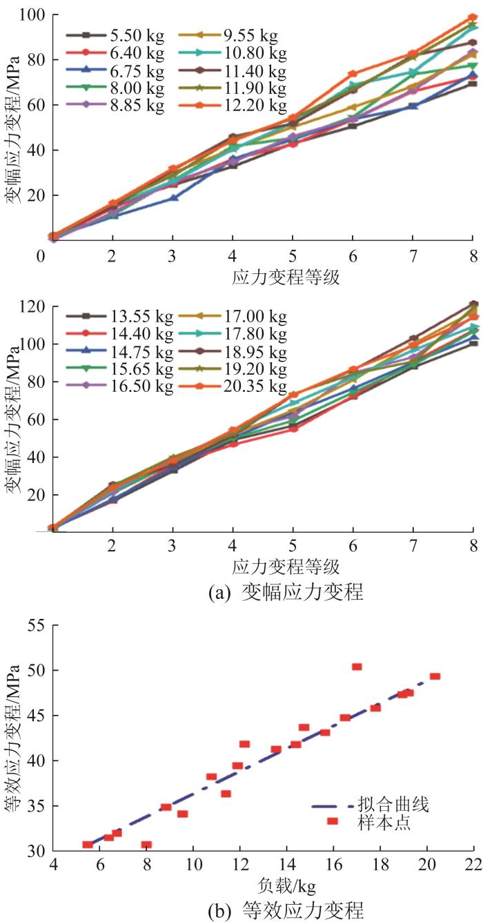 以BiLSTM模型获取的动应力时序数据为基础,采用雨流计数法提取双参数应力谱,分别获得应力幅值谱和应力均值谱。通过式(3)将双参数应力谱转换为应力变程序列后,针对变幅应力变程,依据式(4)的转换机制将其等效为等效应力变程。该方法通过时序数据特征提取与载荷等效转换,实现变幅载荷工况下起重机疲劳损伤时应力特征的量化分析。