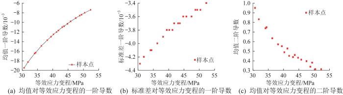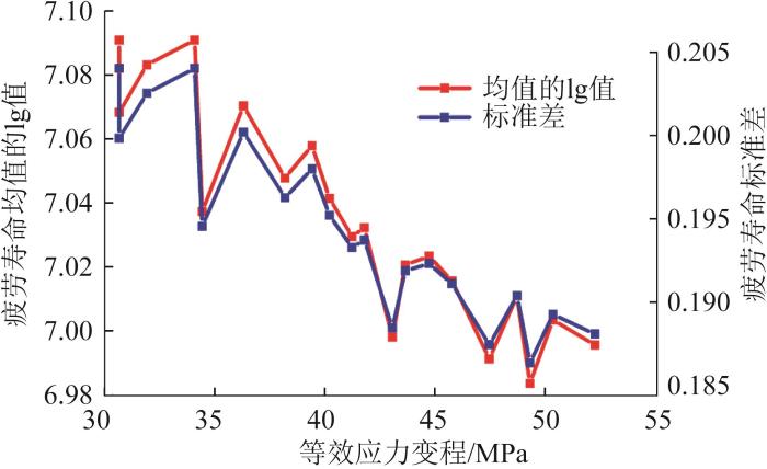 随着应力变程减小,疲劳寿命的方差增大,这表明疲劳寿命具有异方差性。在微小裂纹下,当施加的应力变程较小时,疲劳寿命的大部分时间耗费在小裂纹扩展。在恒定的低应力下,裂纹萌生且受到材料表面局部粗糙度、微观组织不均匀性等因素的影响而增大,结构件的疲劳寿命差异增大,即疲劳寿命的标准差s N 增大。疲劳寿命的标准差对等效应力变程的导数为d s N / d σ ¯ ,在低应力区,等效应力变程的增量Δ σ ¯ 为负值,s N 的增量Δ s N 为正值,疲劳寿命的标准差对应力幅的导数小于0,如式(17)所示。
