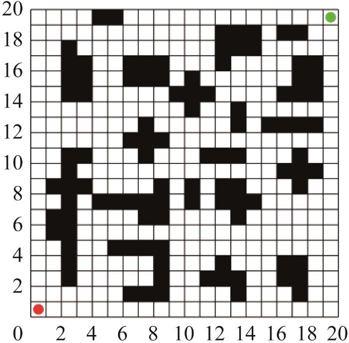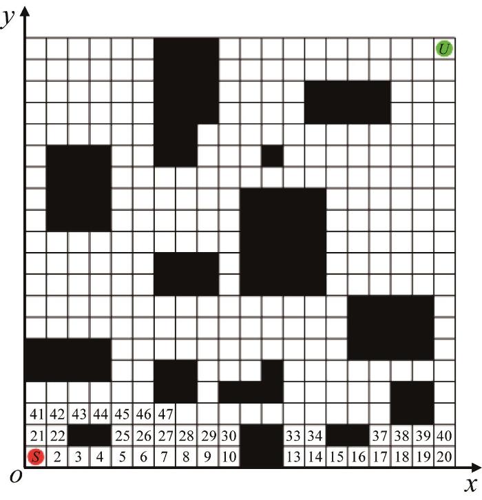 在构建环境模型时通常采用栅格地图。栅格地图由可移动网格和障碍网格组成。可移动网格通常用白色表示,在算法中对应的值为0;障碍网格用黑色表示,在算法中对应的值为1。同时,为每个网格分配一个唯一的序列号。如图1 所示,在20×20的栅格地图中,起始点用S 表示,目标点用U 表示。序列号从起点开始,依次编号直至终点。具体地,第n 个网格的坐标可表示为: