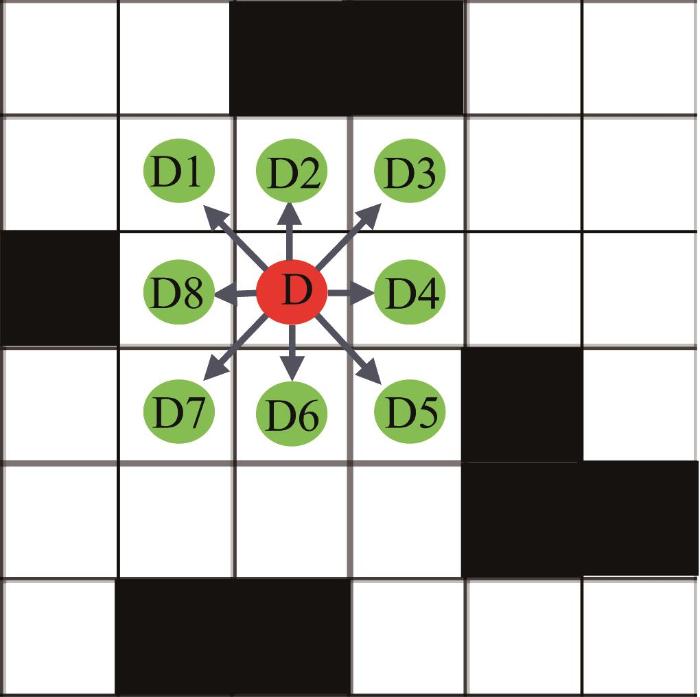 在栅格地图中,每一个网格有8个可移动的方向,移动方向用D1至D8表示,如图2 所示。若网格周围有X 个障碍或不可移动网格时,则可移动方向的数量为8-X 。