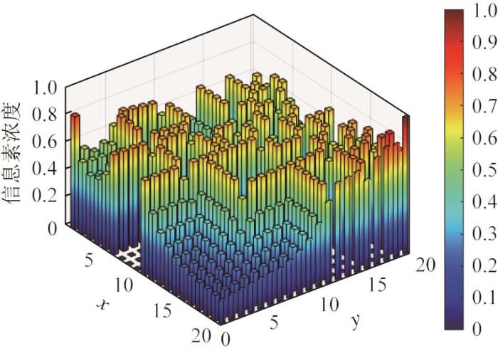 1)在第2行及之后的每一行中,先计算该行所有非障碍物节点的初始信息素浓度τ i , j 0 ,并根据新的初始信息素分配机制对所有节点的信息素浓度进行分配。