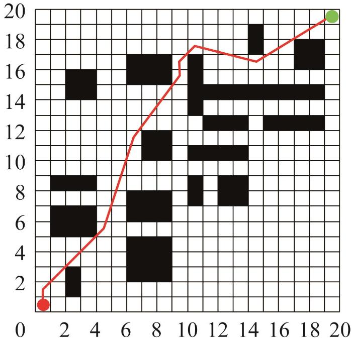 GA模仿自然选择和遗传过程,通过适应度评估和遗传操作(如交叉、变异)来不断优化路径[16 ] 。Ab-Wahab等人[17 ] 提出了一种改进的GA,用于解决低效的种群初始化以及低质量解问题;Chong等人[18 ] 提出了一种改进的自适应GA(improved adaptive GA, IAGA),提升了自主式水下航行器的导航精度。尽管GA能够有效解决复杂的全局优化问题,但仍存在实时性差和易陷入局部最优解的问题。相较于GA,ACO在动态环境中具有更强的适应性和鲁棒性,能够更好地处理路径规划等需要实时调整的任务[19 ] 。ACO是一种模拟蚂蚁觅食行为的优化算法,通过模拟蚂蚁寻找食物的路径选择和信息素传播机制,在解空间中寻找全局最优解[20 ] 。Huo等人[21 ] 使用B样条曲线对ACO所规划路径的平滑度进行了改进,使得路径既符合最大曲率限制,又减少了转弯次数,从而降低了能源消耗。虽然ACO具有较强的适应能力,但其仍存在收敛速度较慢、受参数的影响较大等缺陷。