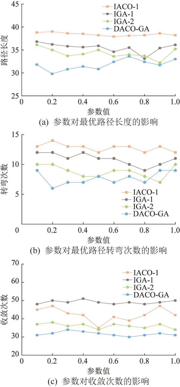 各参数对算法路径规划性能的影响如图11 所示。由图11 (a)与图11 (b)可知,当交叉概率调节系数K c 与变异概率调节系数K m 较大时,最优路径的长度和转弯次数均得到有效改善,但当其数值过大时,反而会导致路径质量降低。当K c =0.8,K m =0.9时,基于IGA-1生成的最优路径长度为33.1,基于IGA-2生成的最优路径长度为32.2,同时可以得到交叉概率与变异概率同时改进相较于仅改进交叉概率具有更强的全局优化效果;由图11 (c)可知,K c 与K m 对收敛次数的影响较小,而初始信息素浓度调节系数γ 对收敛次数的影响显著,尤其是当γ =0.5时,改进初始信息素分布时算法的性能提升最大。综上,DACO-GA综合了上述所有改进策略,可实现路径规划整体性能的最优提升。