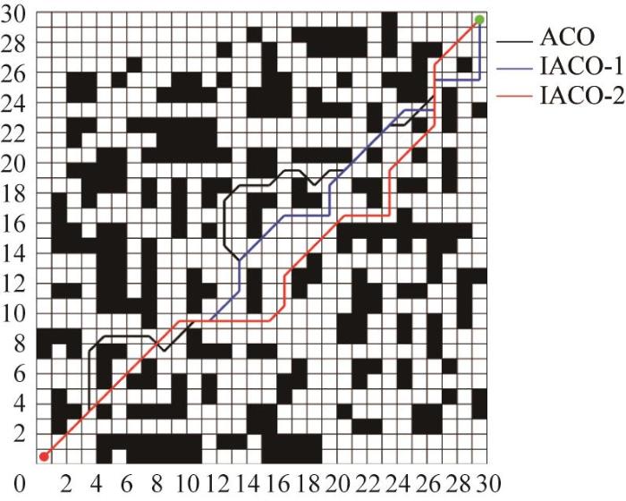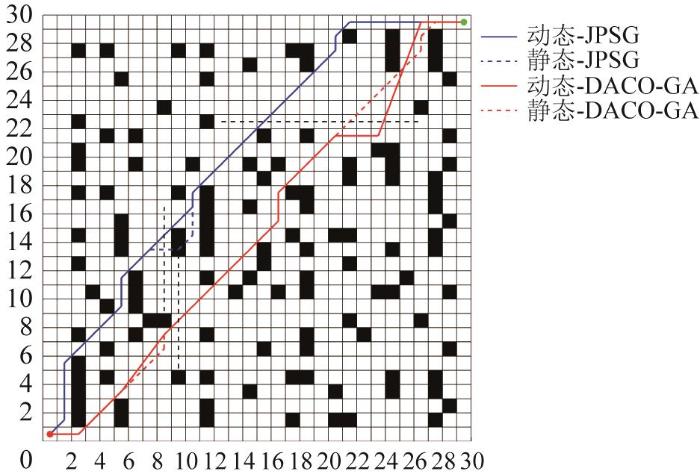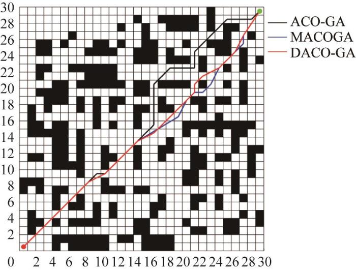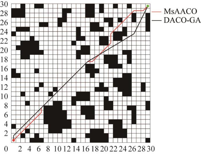 为进一步验证各参数设置的普适性,构建了一个结构更为复杂的栅格地图(30×30),地图设计参考文献[25 ]。在该场景下,对本文所提出的DACO-GA与文献[25 ]提出的MsAACO(multi-strategy adaptable ant colony optimization,多策略可适应蚁群算法)的性能进行对比。为了考察最优路径的平滑性,引入平滑度s :