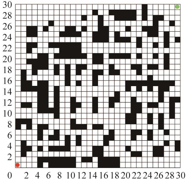 ... ]中的MACOGA(modified ACO and GA)进行对比,以综合验证各改进机制的有效性及其结合效果.本实验中的仿真地图与文献[24 ]一致,如图13 所示.其中:起始点S 用红点表示,坐标为(0.5, 0.5),位于地图的左下角;目标点U 用绿点表示,坐标为(29.5, 29.5),位于地图的右上角. ...