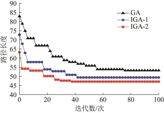 若多样性不超过多样性阈值,则说明路径的多样性较差,可能会导致次优解出现,故以GA为主导算法,通过交叉和变异操作扩大搜索范围,以提高路径的多样性。若多样性超过多样性阈值,则计算当前路径的改进幅度,并与改进幅度阈值进行比较:若改进幅度小于改进幅度阈值,则以ACO为主导算法,利用信息素更新路径选择的概率,以增强局部搜索能力;反之,则说明路径正在快速收敛,继续使用上一次的优化算法。同时,为了避免最优路径在ACO的操作中被破坏,在每次通过动态机制判断后,用当前迭代的最优路径替换下一次迭代的最差路径。此外,在动态融合阶段的每一次迭代中,均实时计算路径的多样性,并根据结果动态调整主导算法,以实现对路径的针对性优化。