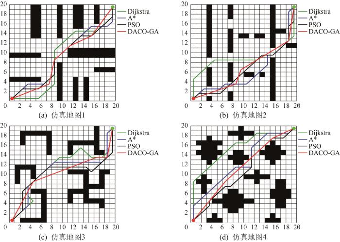 路径规划算法可分为全局路径规划与局部路径规划两类[1 -2 ] 。常见的全局路径规划算法包括Dijkstra算法[3 ] 、A*算法[4 ] 和快速扩展随机树(rapidly-exploring random tree, RRT)[5 ] ;常见的局部路径规划算法包括人工势场法(artificial potential field, APF) [6 ] 、动态窗口法(dynamic window approach, DWA)[7 ] 等。尽管这些算法在不同的应用场景中表现出独特的优势,但它们也存在一定的局限性[8 ] 。例如:全局路径规划算法能够解决复杂的路径规划问题并避免局部最优解,但通常需要较大的计算开销且收敛速度较慢[9 ] ;局部路径规划算法适用于已知初始解或问题规模较小的情况,其具有较高的计算效率和较快的收敛速度,但容易陷入局部最优[10 -11 ] 。与此同时,许多受生物学原理启发的优化算法被广泛应用于路径规划。常见的启发式优化算法包括模拟退火(simulated annealing, SA)算法[12 ] 、粒子群优化(particle swarm optimization, PSO)算法[13 ] 、遗传算法(genetic algorithm, GA)[14 ] 和蚁群算法(ant colony optimization, ACO)[15 ] 等。